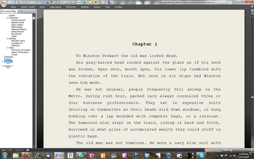 I write on a PC. Always have, (at least since the Computer Age,) and since the early nineties I’ve used Microsoft Word. Word is not exactly designed for the needs of a novelist, but rather for business in general and has everything possible stuffed into it and little in the way of customization allowed. So I was looking forward to finding a tool that was designed with me, and my profession, in mind.