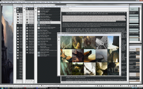 Once more, in addition to the word processor, LSBX allows for jumping around to different files inside the program, but in addition also has nifty things like a Timeline, Character Dossiers, and Mindmaps. There are also word usage programs that help show when you reuse a word too often, and a bunch of other statistics that might be interesting to an author (or more importantly an editor.) It has storyboarding, image galleries, even a music player to be used for audio inspiration.
