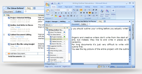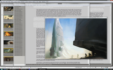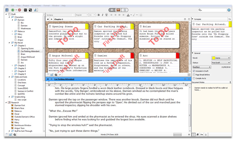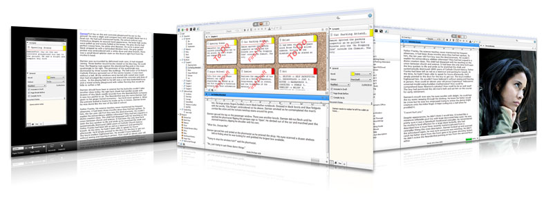 Along the left side of the main Scrivener window is a Windows Explorer type of file and folder tree that allows the user to click on, and instantly jump, to another file. This means that you can organize (by drag-and-drop) and instantly open notes, images, or look at an outline, without leaving the word processor. This is convenient and saves the effort of opening windows, finding the files, opening them, adjusting the placement of the windows, etc. It also supports images. I liked this feature quite a bit. I also thought the corkboard where you had a virtual place to layout index cards with notes on them, was fun.