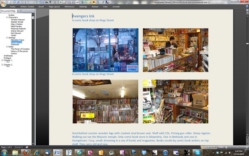 So if you are in the market for a Scrivener-like program for Windows, you’re in luck, Scrivener itself will be available real soon. And if you want to play with a highly customizable writing program, you can try LSBX. But if you already have Word and would just like to make the writing process a tad more efficient, you might try customizing it using the Doc Map and the custom menu bar as I have. It isn’t as pretty, but it works.